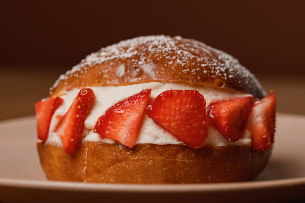 The pastry counter is impossible to ignore. I was immediately drawn to the pistachio and strawberry maritozzo — soft brioche buns split open and stuffed with whipped cream. I went for pistachio, and it was rich and generous. Honestly, it’s a share-with-a-friend kind of treat unless you’re fully committed to a sugar high.