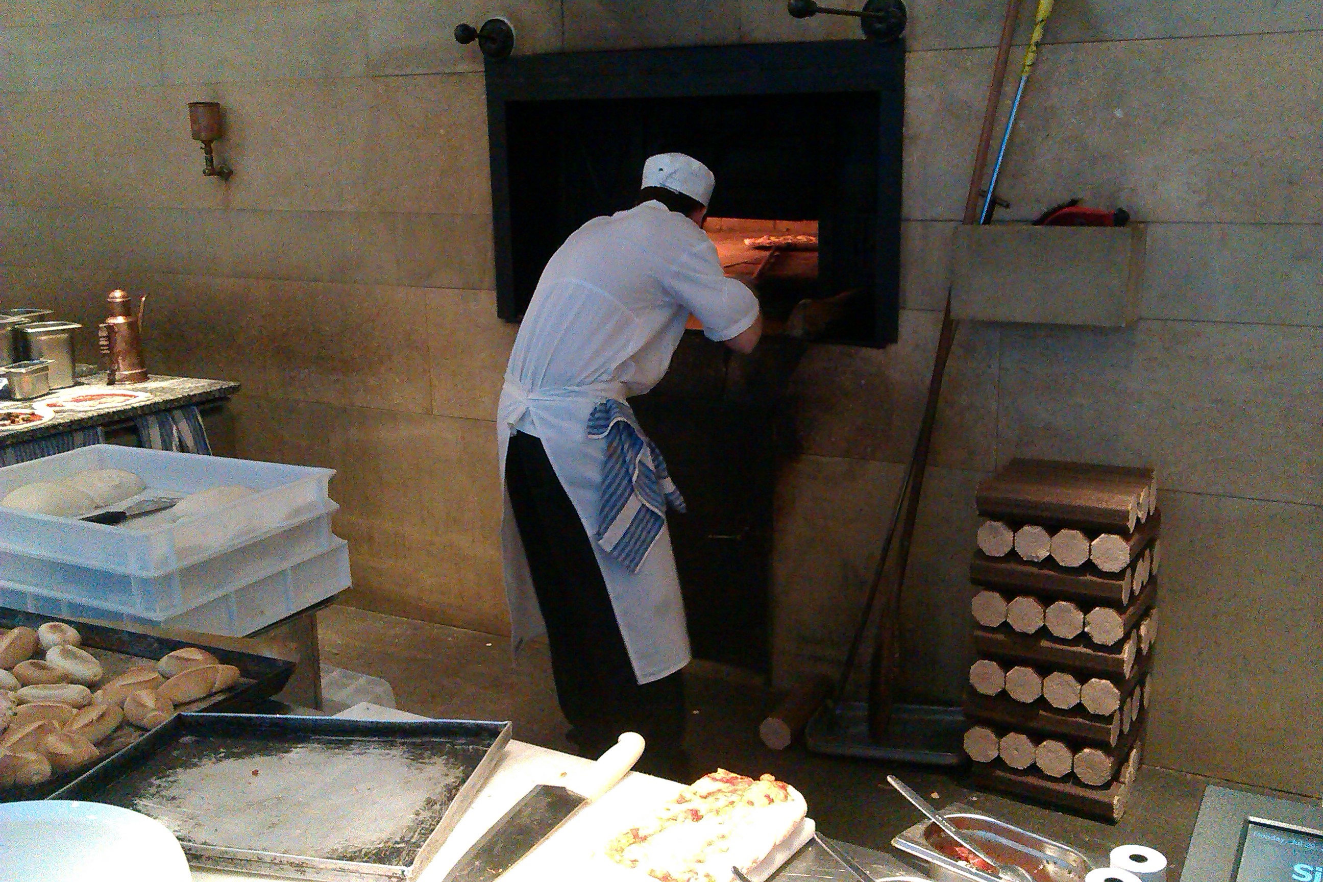 Steer left and enter the pizzeria restaurant. With pooosh waiting staff and smell wafting pizza oven.