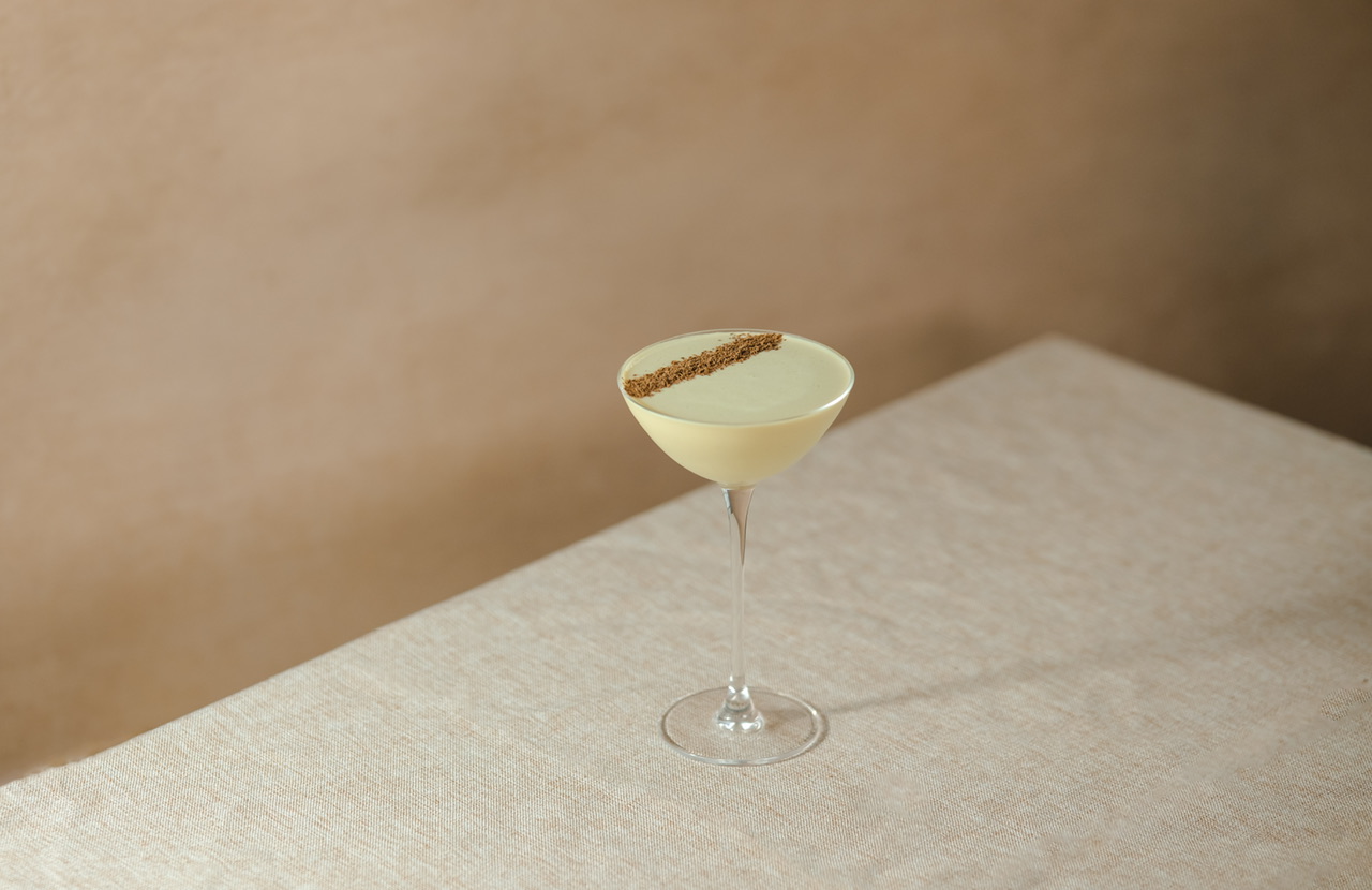 Shake ingredients with ice, strain into a coupe glass, garnish with grated chocolate and pistachios.
