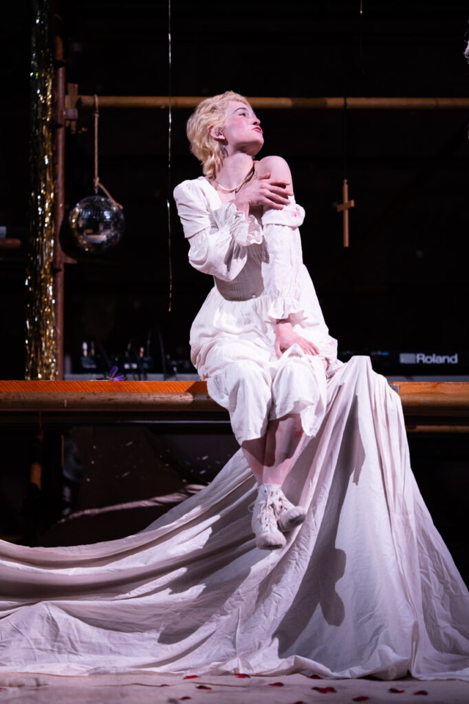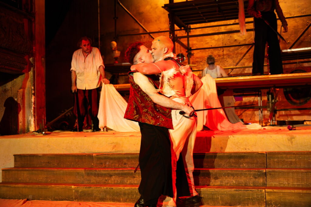 The language remains front and centre, but it’s carried along by movement and folk music. Movement is a huge part of this production, directed by Slovak theatre artist Matej Matejka. The scaffolding serves multiple purposes—from hosting the iconic balcony scene to becoming Juliet’s final resting place as roses fall dramatically from above. The ensemble remains on stage throughout, constantly shifting roles or playing instruments. One standout moment is the handfasting during Romeo and Juliet’s wedding, where a rope is gently wrapped around their hands. Another moment is Kyll Thomas-Cole’s streetwise Romeo and Lennie Longworth’s Juliet twisting around each other.