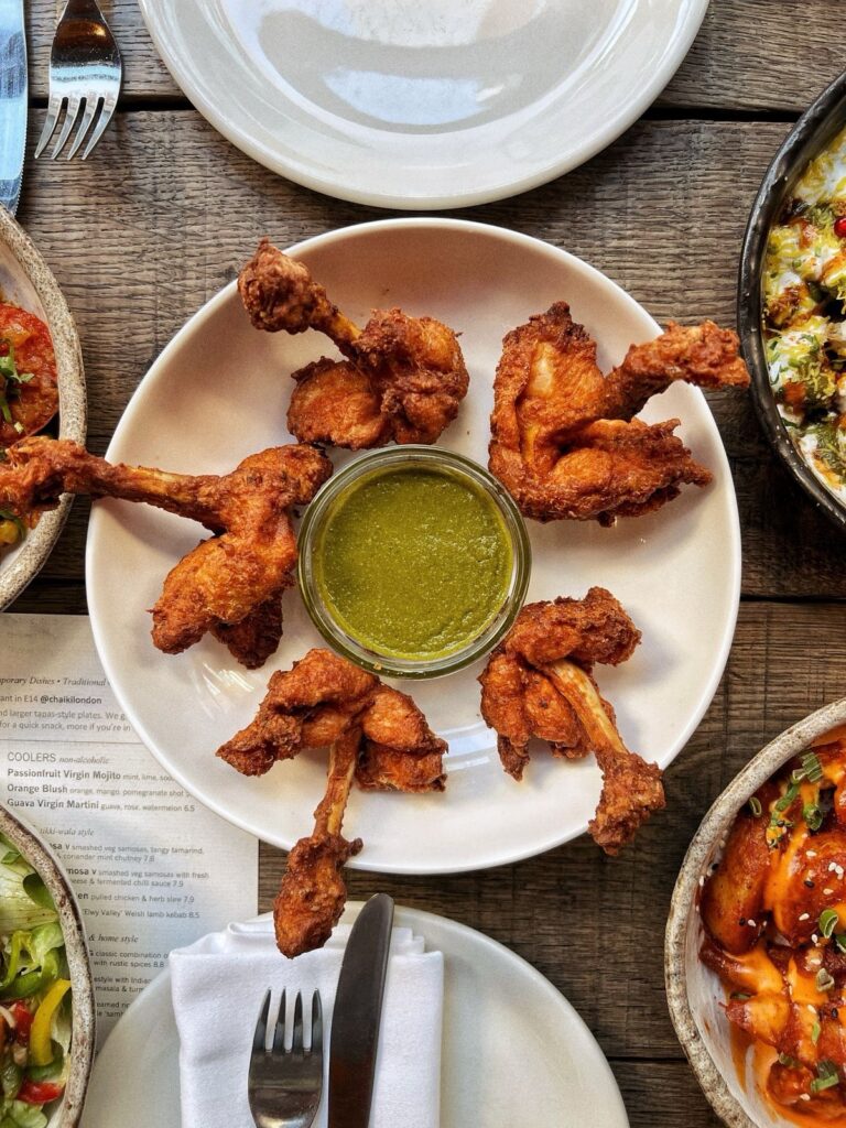 Upstairs the Street Kitchen offers a lively, casual experience celebrating the playful, vibrant street foods of India. Enjoy the zesty Warm Chilli Paneer Salad, irresistible crispy Chicken Lollipops, and the interactive delights of Pani Puri and Papri Chaat, ideal for festive gatherings with a fun twist.