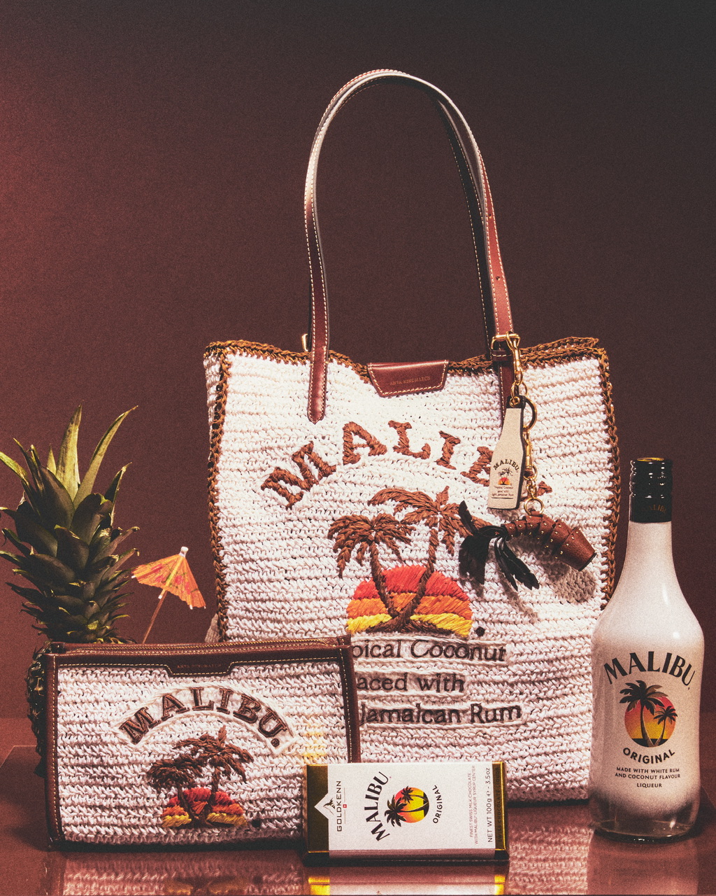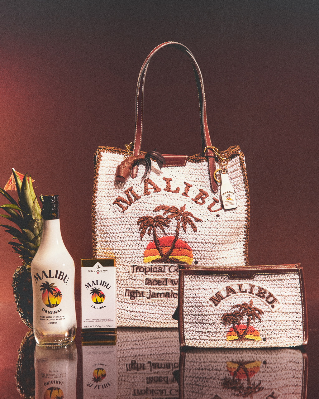 In homage to the shop’s nostalgic eighties summer vibe, each accessory reimagines Malibu’s original label design – twin palm trees silhouetted against the burnished orange glow of the setting sun. The playful collection blends the iconicity of Malibu’s origins with the signature wit and craftmanship of British designer Anya Hindmarch. Known for her exceptional attention to detail and obsession with organization, Anya adds clever compartments and unexpected finishing touches to the capsule, elevating cult classics with her distinctly modern, joyful approach to luxury.