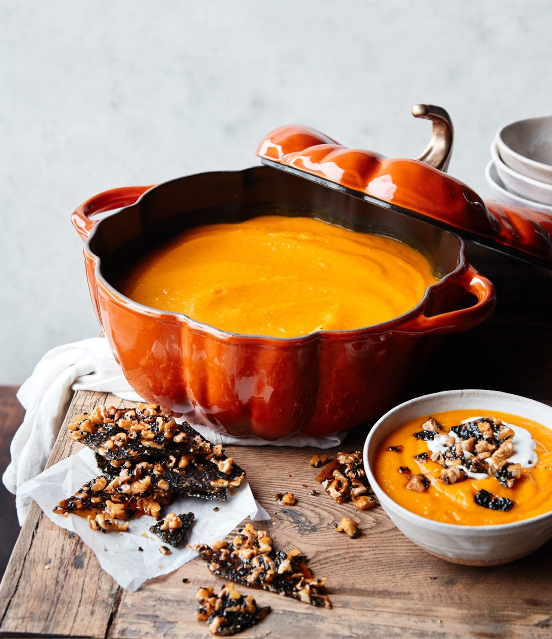 - Working in batches, blend the soup until smooth and return to the Cocotte. Spoon into bowls and serve immediately, with a dollop of creme fraiche, and a sprinkle of brittle.