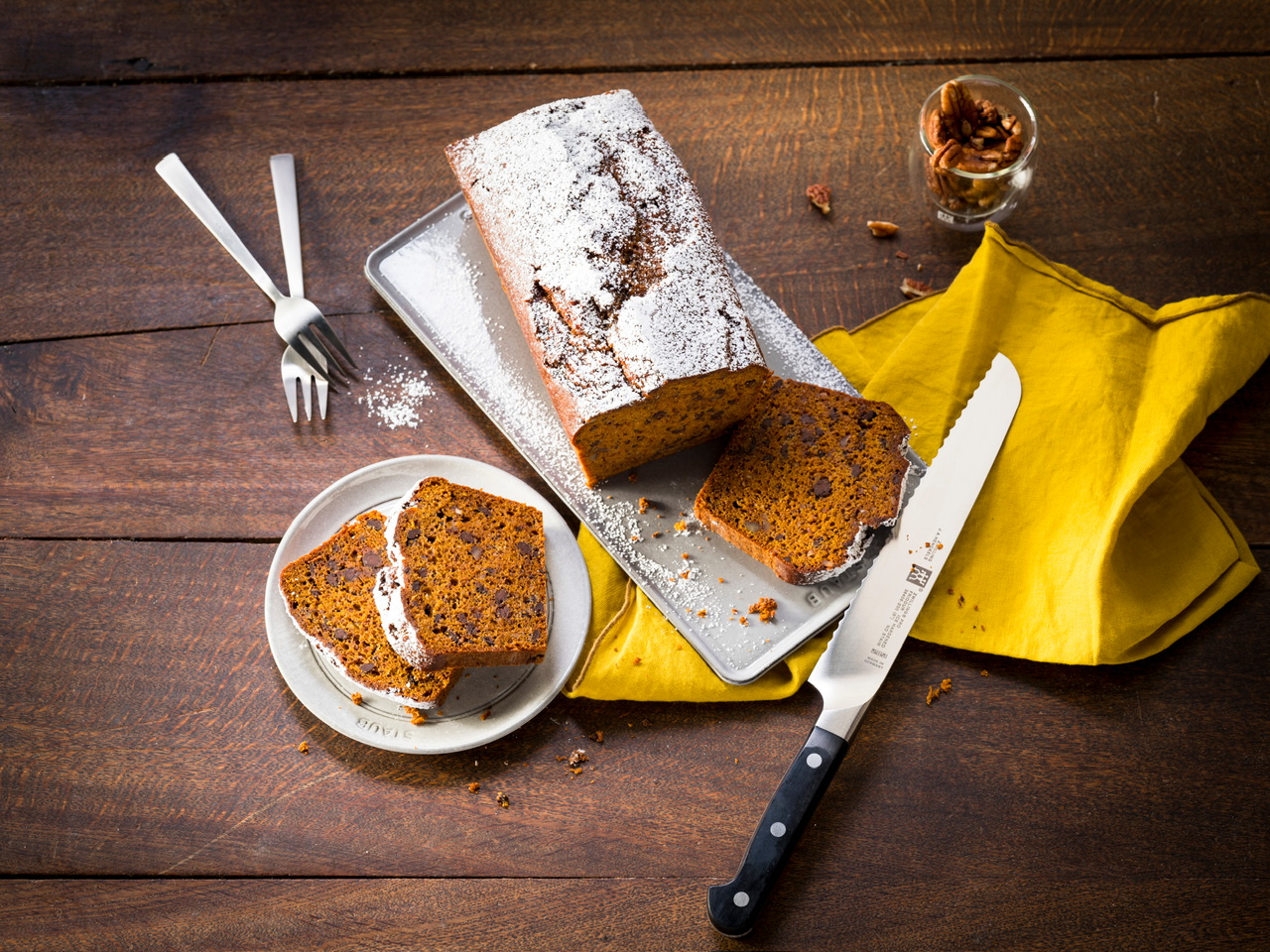 - Once the blending is finished, remove the lid. Briefly mix in the pecan nuts and chocolate drops manually or fold in with a spatula. Pour the dough evenly into the prepared loaf tin.