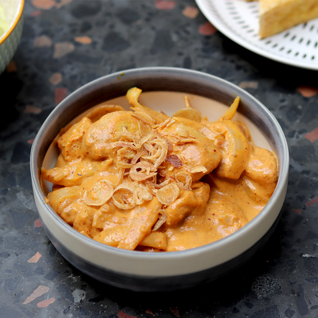Massaman Curry: a rich curry full of silk road spices, cashews and potatoes. Choose from tofu, chicken or smoked duck.