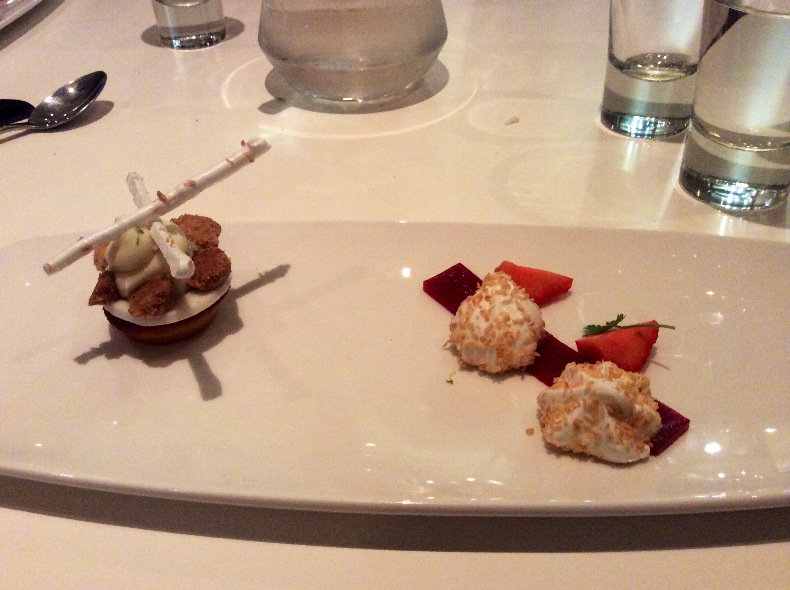 Finally the dessert. Marshmallow dollops covering a line of strawberry jam paired with a tart encasing coconut ganache and lime moelieux. All topped off with two thin merengue sticks. It was lush. The zesty lime really cut through the sweetness and balanced the dish.