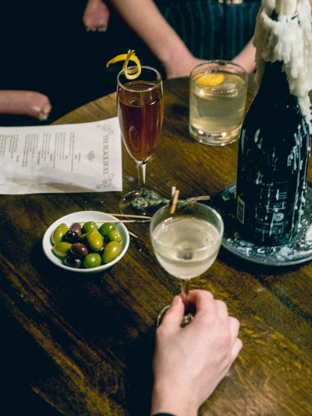 The Black Duke launches with a new cocktail menu arranged into four sections—Fizzy, Still, Shaken and Non-Alcoholic—each showcasing creative interpretations of classics. Highlights include a Champagne Cocktail made with Pol Roger Brut Reserve, Brown Butter Armagnac and Kokuto sugar; a Brunswick Martini built from No.3 London Gin, Vermouth, Génépi and Hay; and an El Presidente combining rum, vermouth, persimmon and pastis. The Bergamot Margarita introduces a citrus-bright twist on the much-loved staple, while the Botivo Daisy provides a fully non-alcoholic option using 0% Botivo mixed with figs and citrus.