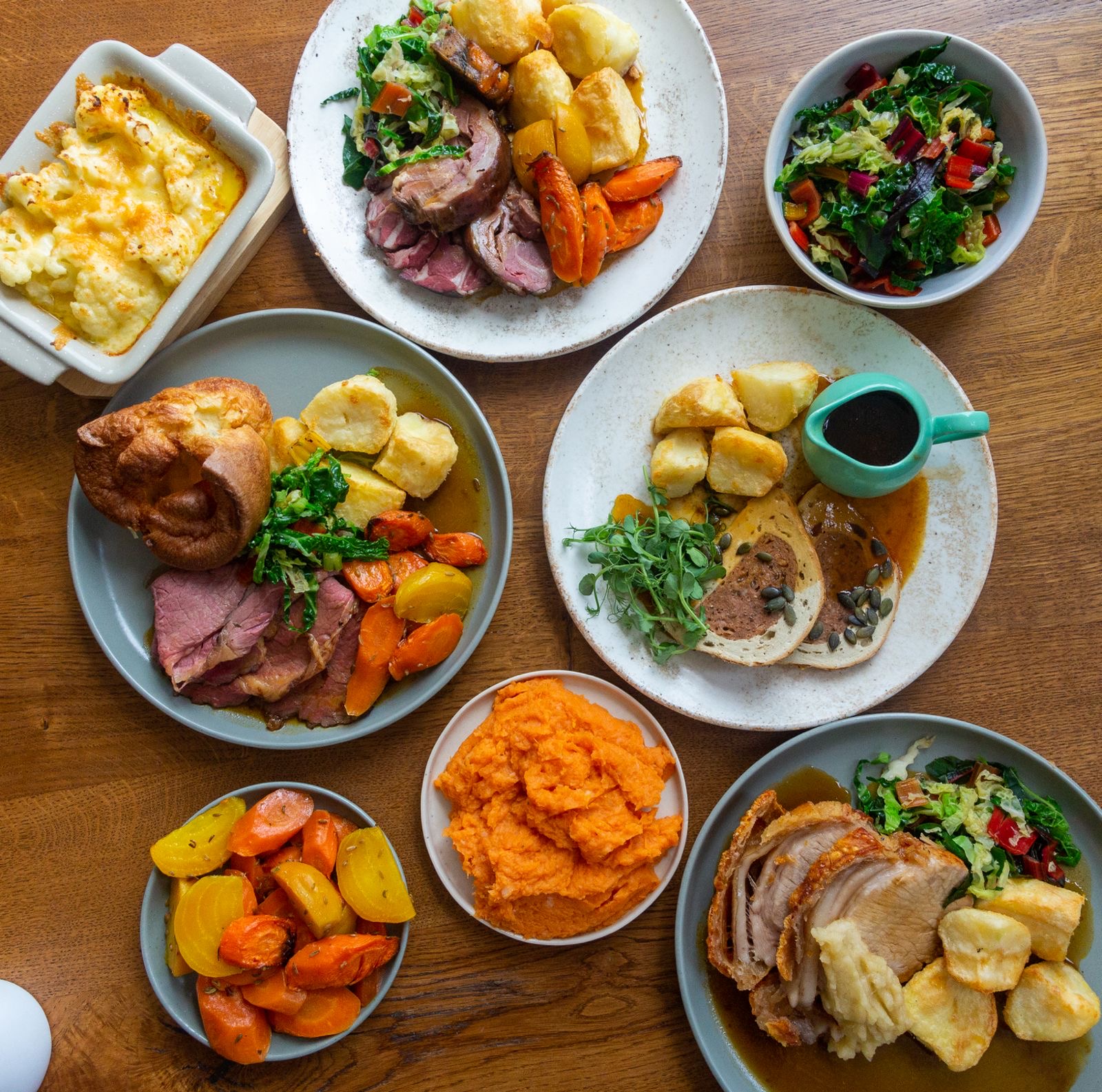 Each roast is accompanied by a generous array of family-style sides designed for sharing and second helpings. Enjoy beef fat roast potatoes, sweet potato mash, rainbow chard, roasted carrots with fennel seeds, kale, and savoy cabbage, all generously topped with rich, homemade gravy.