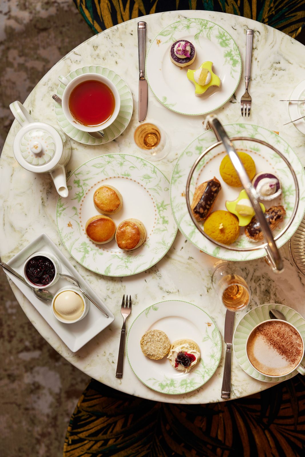 Warm scones follow, in both traditional plain and a fragrant star anise and orange zest variation, served with raspberry and blackberry organic preserves and a generous helping of Cornish clotted cream. The sweet course brings the Afternoon Tea to its most whimsical moment, drawing inspiration from London’s beloved parks. A creamy lavender-kissed cheesecake nods to the calm of Primrose Hill; a glossy chocolate éclair echoes the classic elegance of Hyde Park; a spiced choux bun topped with gold leaf captures the quiet grandeur of Green Park; and a pineapple-and-yuzu entremet pays tribute to the serenity of Holland Park’s Kyoto Garden.