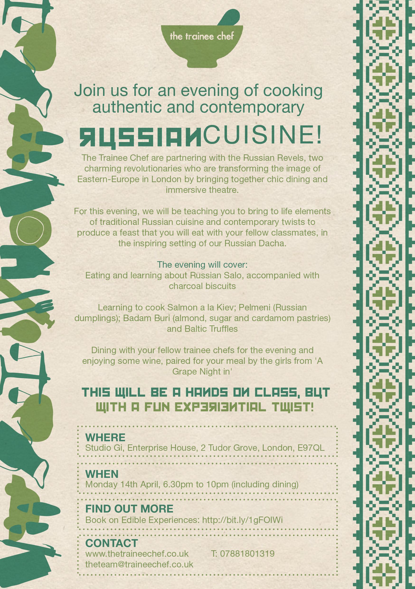 The evening will be centred around teaching and chomping Russian style, with different traditional and contemporary Russian dishes being brought to the table. Think Salo andĀ Salmon a la Kiev while chatting to the chefs that helped make them!