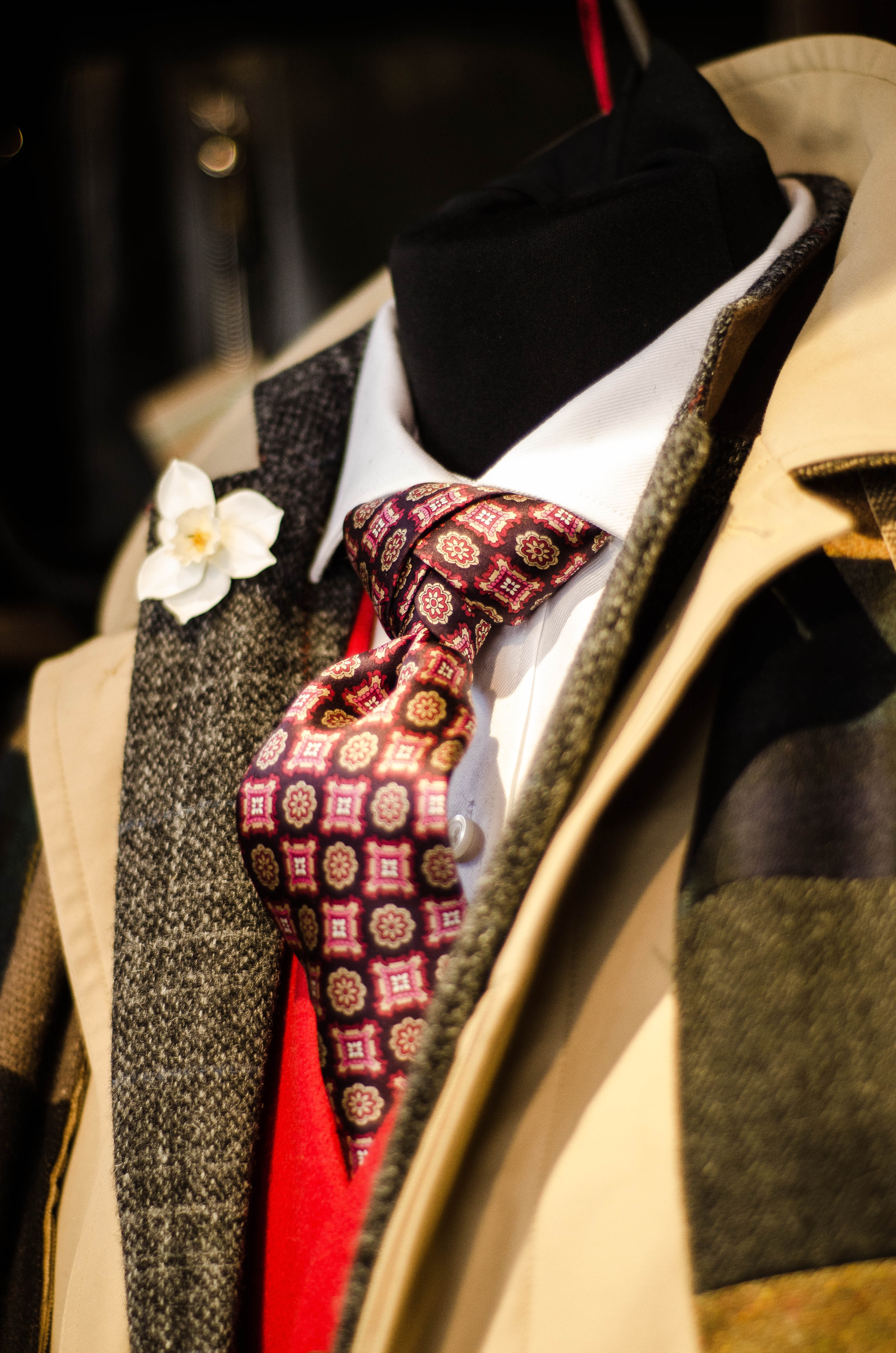 Having worked in menswear and knowing how to appreciate good visual merchandising, not to mention a shop that screams history and quality, I had to investigate further. Upon entering you are almost overwhelmed by the array of materials, colours and above all the feeling that you have stepped back nearly 100 years to the golden age of dressing and into an Edwardian railway station. This is further enhanced by the presence of stuffed animals, leather arcana and battered luggage all around the shop. These are used in all manner of interesting ways, from the goose with a bow tie, which is fast becoming a signature of the shop, to the pheasants in the window displays and the abacus used as a tie rack.