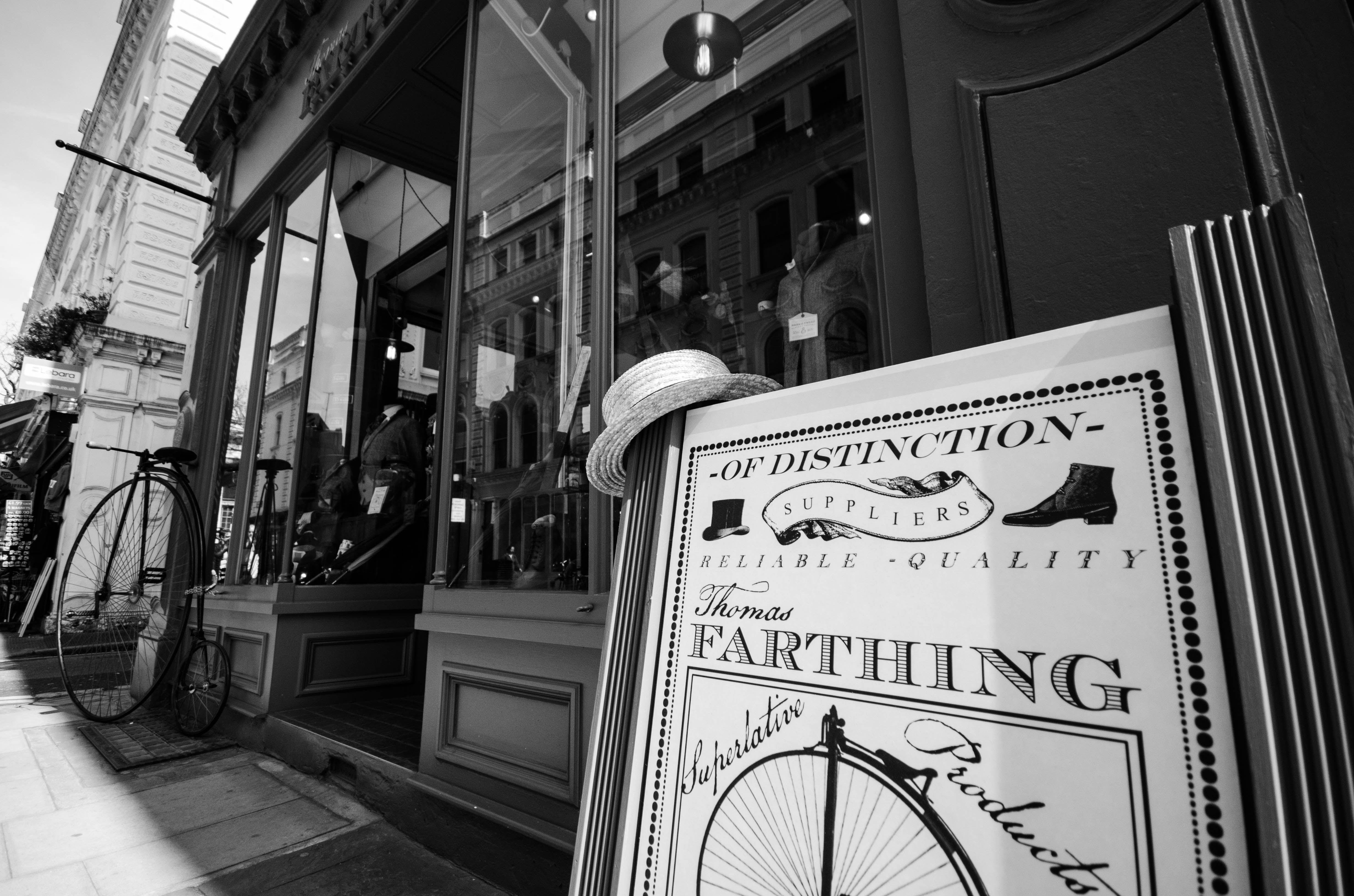 I stumbled across Thomas Farthing on a sunny Sunday afternoon having just been to the British Museum and having some time to kill, I decided to see what the side streets in the area had to offer. Almost immediately my eye was drawn to a penny farthing leant against a shop window and the most fantastically well displayed windows; this seemed a little out of place on sleepy Museum Street.
