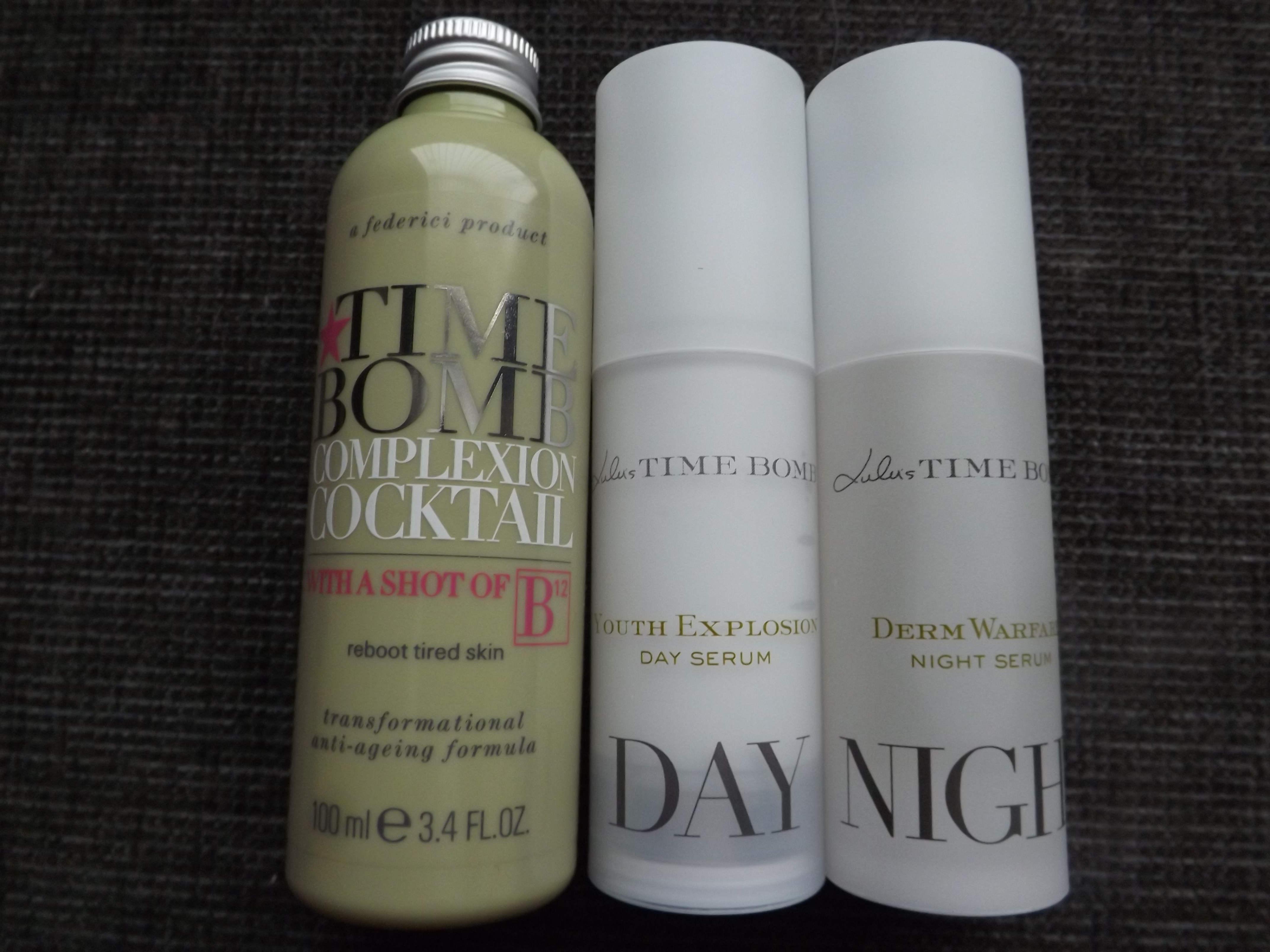 I have recently discovered these gorgeous Time Bomb skincare products: Complexion Cocktail with a shot of B12, Youth Explosion Day Serum and Derm Warfare Night Serum.
