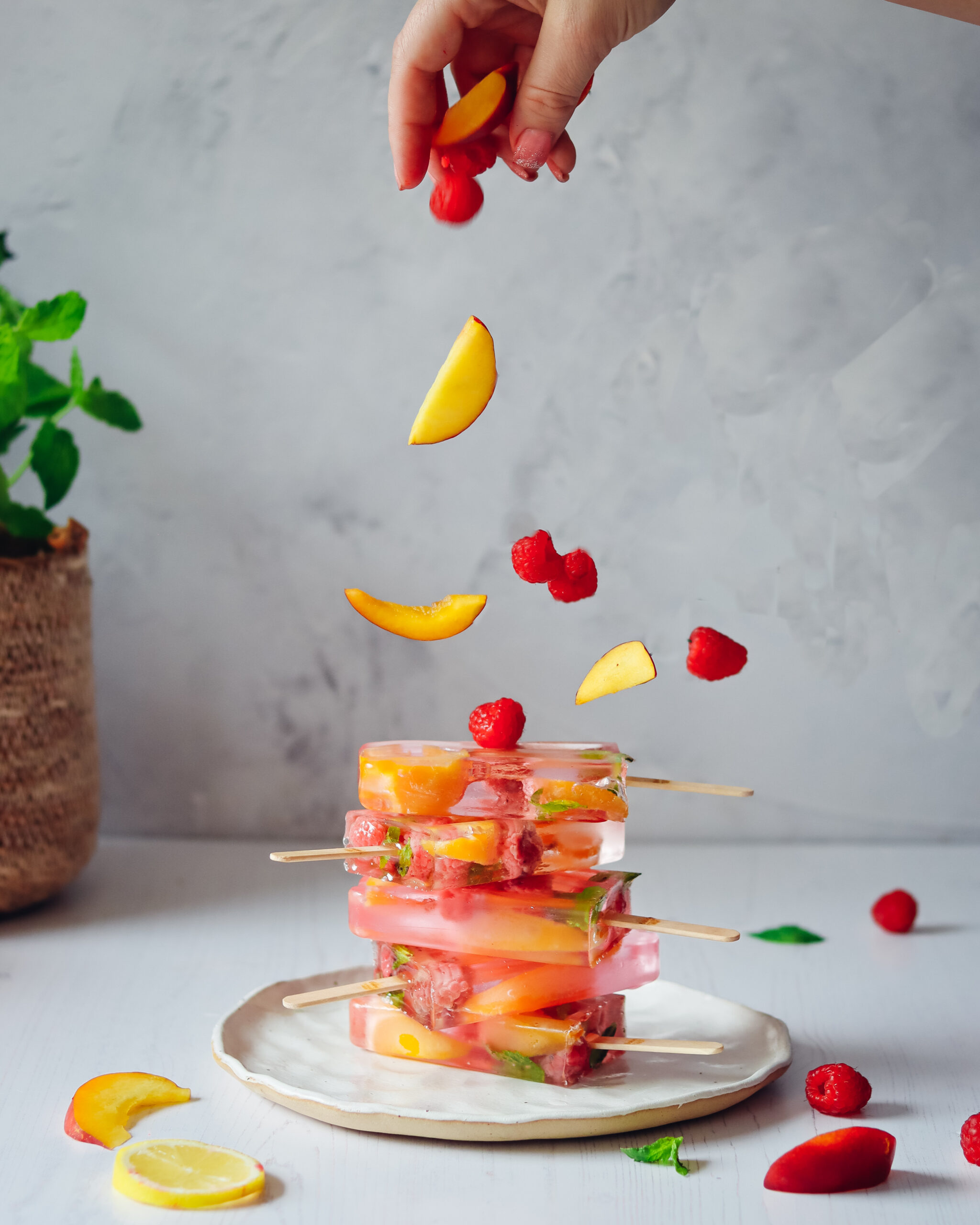 Place the fresh raspberries and peach slices evenly into the six ice lolly moulds.