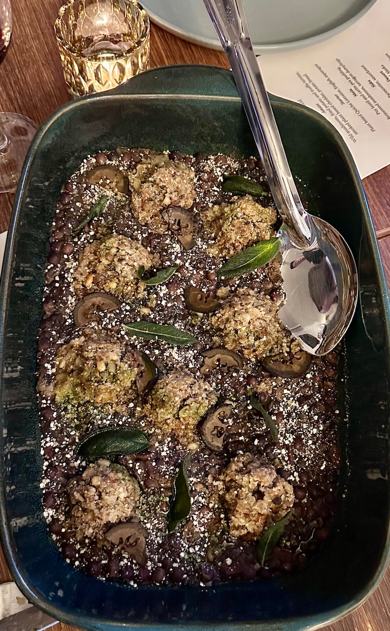 For mains there was a traditional North England dish- pease pudding with ham haddock. As described on the evening, this ‘poor people’s food’ from the past was tonight served in a rich way. This was thick and creamy and the pork pulled apart easily. The vegan alternative also showcased North England, featuring Carlin peas which are a historic marbled brown pea. This was in a lentil and carlin pea pudding with fermented mushroom and tarragon dumplings. My friend and I both felt the mushrooms had a stronger flavour here than the amuse-bouche, but we liked the burst of flavour biting into the lentils. Both were served with parmentier potatoes and sauerkraut.