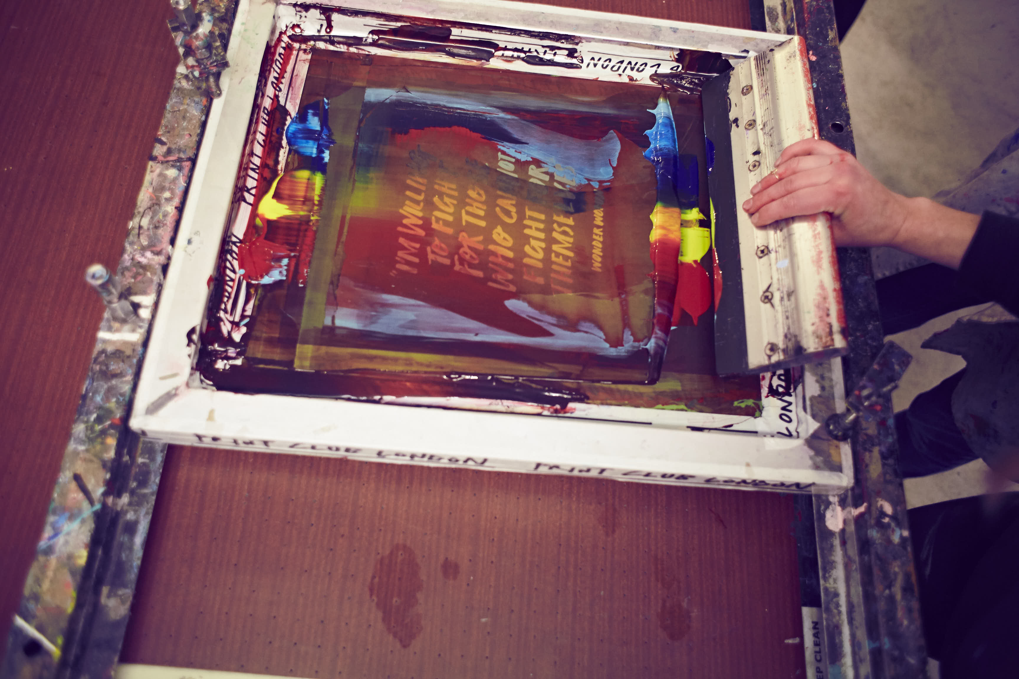 But what exactly is screen printing? Essentially it is a printing technique forcing ink onto material using mesh and stencils. Using a blade or squeegee, the printer pulls the ink across the frame which has been placed above the material that the artwork will go onto.This process results in the ink wetting the material and being pulled out of the mesh. Once the blade passes, the screen springs back and the frame is lifted to display the artwork.